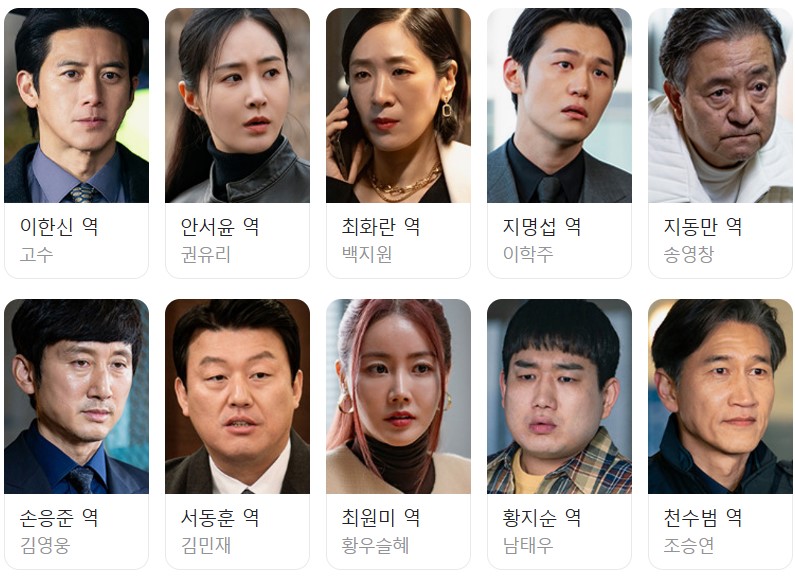 - 지동만 : 오정그룹 회장으로, 이한신의 심사 대상이 되는 인물입니다. 그의 과거와 현재가 드라마의 주요 갈등 요소로 작용합니다.