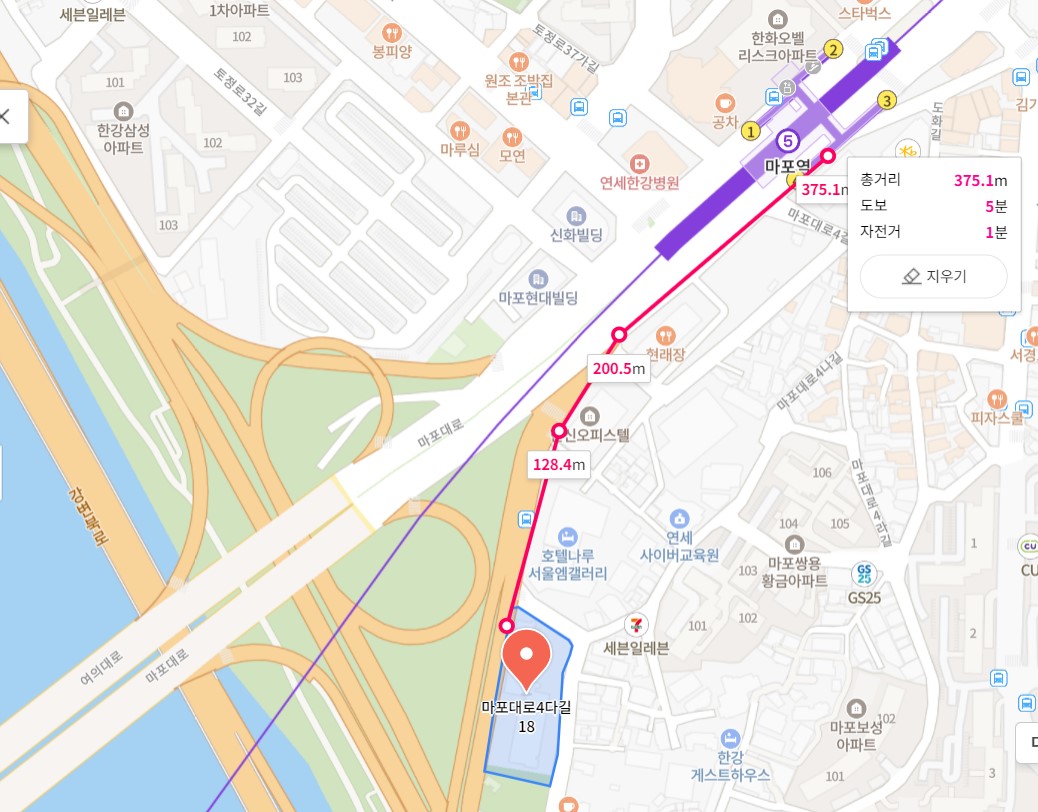 위치는 마포대교 북단에 위치하고 있고 한강이 보이는 아파트 입니다. 마포역까지 도보로 5분거리의 역세권 아파트 입니다.