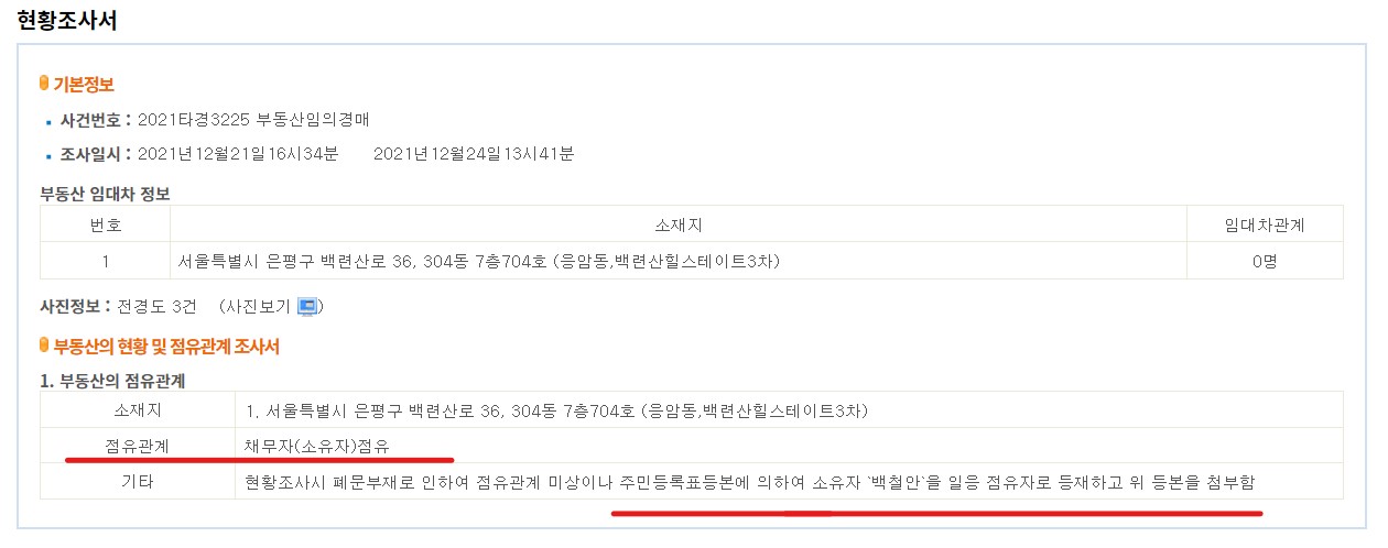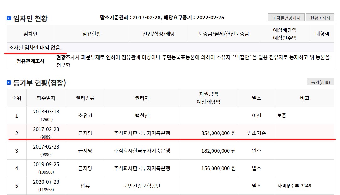 임차인 현황과 등기부를 살펴보면 현재 임차인으로 조사된 바 없고 등기부도 말소기준 위에 선순위 권리가 따로 없는 깔끔한 물건 입니다. 매각건물건명세서도 깨끗하고 현황조사서에도 점유관계가 소유자로 되어있습니다. 다만, 한번 매각되었다가 재매각으로 나온건인 만큼 불허가 사유나 기타 권리관계에 이상이 없는지 꼼꼼한 체크가 필요해 보입니다.