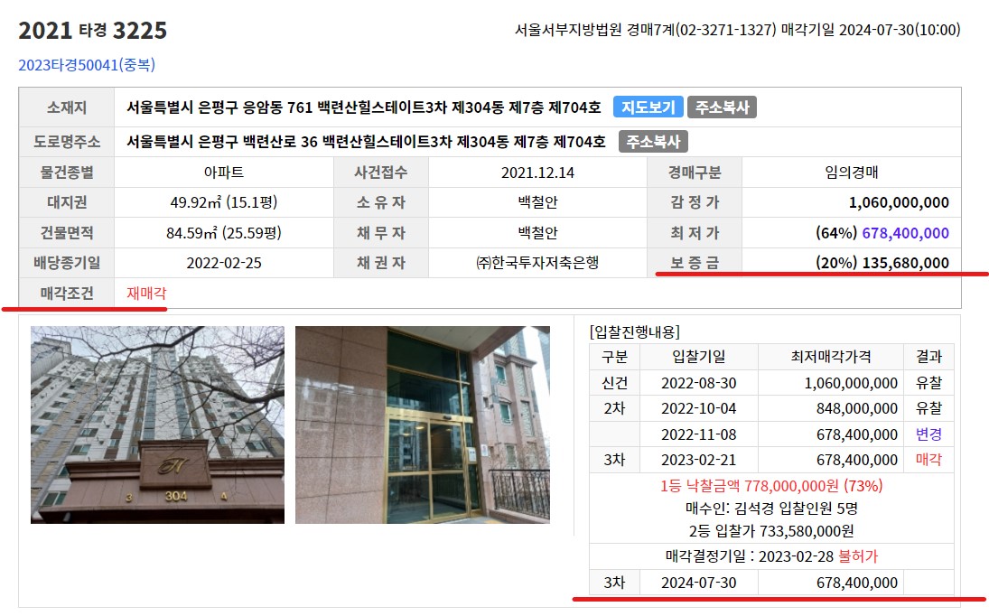 서울 은평구에 있는 백련힐스테이 3차 33평 아파트로 감정가 1,060,000,000원 경매유찰과 불허가 처리되어 재매각에 나온 건으로 현재 최저가 678,400,000원 에 나와 있는 물건 입니다. 불허가 처분에 의한 재매각건으로 입찰보증금이 20% 입니다.