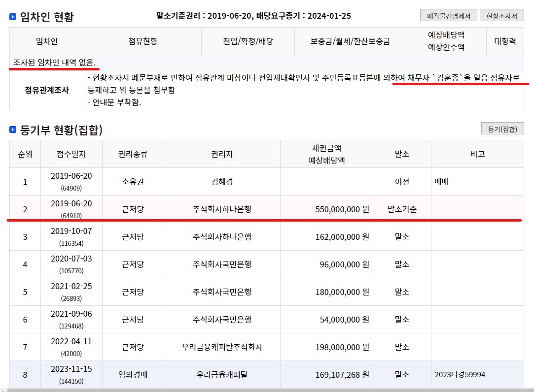 임차인 현황과 등기부 현황, 현황조사서를 살펴봐도 권리관계가 있는 임차인도 없고 낙찰 후 인수해야 될 권리도 없는 깨끗한 물건 입니다.