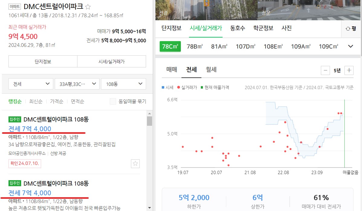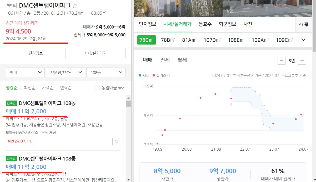 네이버 부동산 매매거래가가 평균 11억 2천만 정도이고, 전세가도 평규 7억~7억5천만 선에서 형성되고 있습니다. 이 지역 평균 낙찰률을 감안하면 대략 10억 5천만원 전후로 낙찰가가 결정되지 않을까 예상 됩니다.