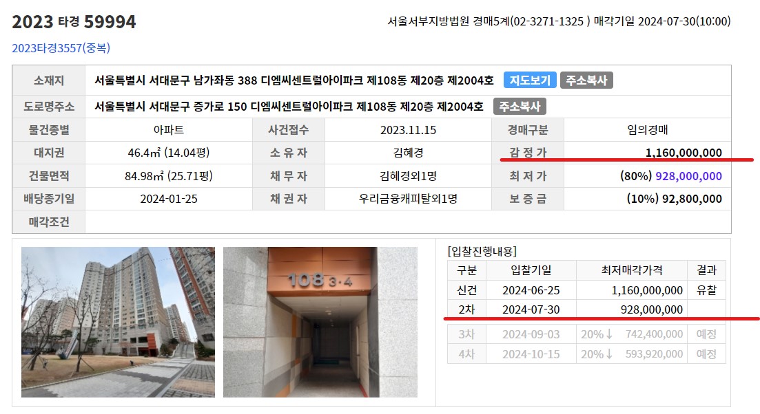 남가좌동 디엠씨센트럴아이파크 아파트로 감정가 1,160,000,000원에 최저가 928,000,000원에 나와 있는 물건 입니다.