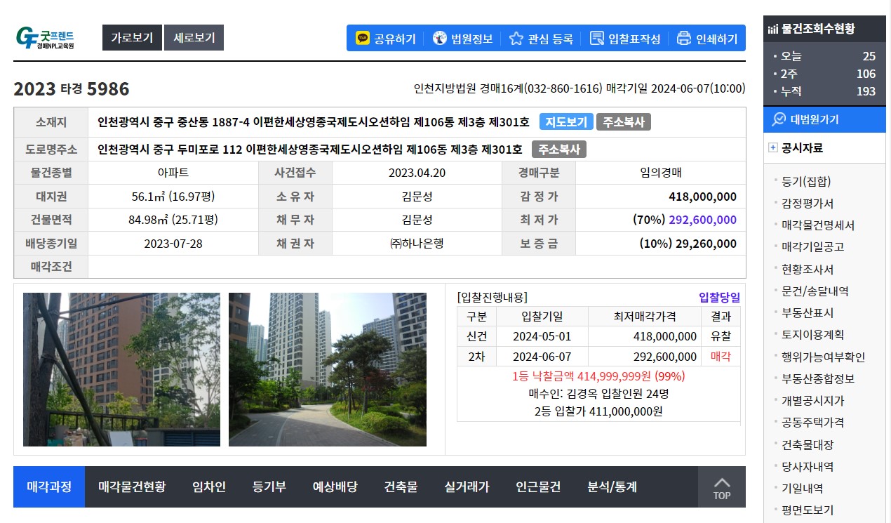 먼저 아파트 경매 결과 입니다. 경매 정보지를 확인해 보니 2차 매각에 총 24명이 입찰 참가하여 1등 414,999,999원에 무려 감정가 대비 99%로에 낙찰 되었습니다. 제 예상은 85%정도 생각했는데 예상보다 너무 많은 입찰 인원과 낙찰금액입니다. 결과를 보시면 아시겠지만 역시나 하자 없는 물건은 상대적으로 입찰 인원이 많고 입찰 인원이 많은 만큼 경쟁도 치열해져 낙찰 금액도 높아지게 됩니다. 제가 입찰에 참가한 건이 아니라 실제 현장 거래가를 파악하지는 않았지만 실거래가 조사시 대략적 매매금액이 4억 3천 정도였던걸 감안하면 경매 투자치고는 수익률이 그리 많이 남지 않은 건이 아닌가 싶습니다. 금액적으론 대략 1,000~1,500만원 정도 남는거라 제 생각엔 성공적인 투자라 보기 어렵습니다. 물론 향후 상승 가치를 어떻게 보느냐에 따라 다르지만 제가 살고 있는 주민의 입장에선 향후 크게 상승할 것 같지 않습니다.
