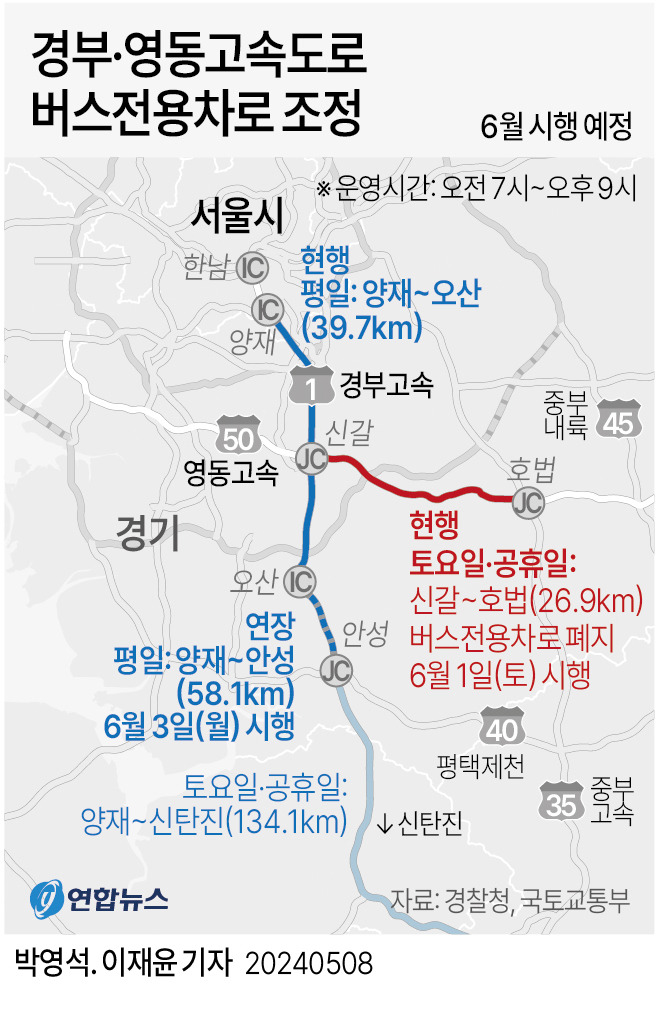 경부고속도로 버스전용차선 운영 시간 및 구간을 나타낸 지도입니다.