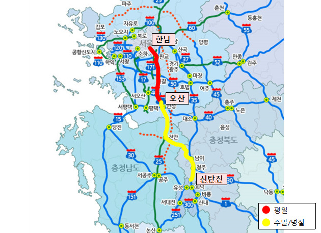 경부고속도로의 버스전용차선 구간을 나타낸 지도입니다.