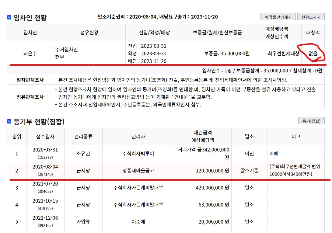 임차인 최00씨가 있으나 후순위 대항력이 없으며, 임차인은 소액 임차인으로 최우선변제 대상자 입니다. 배당순위에서 최우선으로 보증금 변제 받기 때문에 낙찰자가 인수해야할 권리 관계가 전혀 없는 깨끗한 물건 입니다. 낙찰 후 명도도 쉽게 진행될 물건 입니다.(임차인이 배당금을 받아야 하기 때문에)