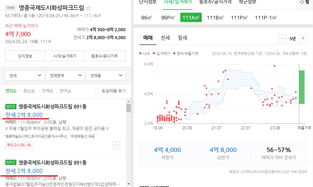 네이버 부동산 매매 실거래가 4억 8,000만원에서 5억 정도에 거래되고 있으면 전세는 평균 2억 8천만원에 거래되고 있습니다.