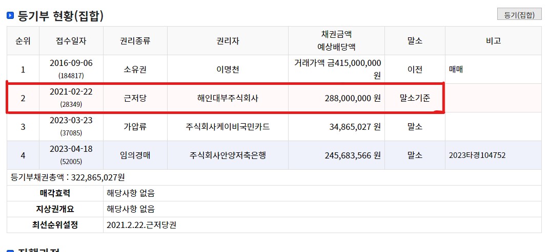 다시말해, 말소기준에 부합하는 저당권, 근저당권, 압류, 가압류등을 찾아 먼저 돈을 빌려준 곳을 알아내면 그 밑으로 설정된 권리는 소멸합니다. 그 위로 설정된 권리는 인수해야 합니다. 낙찰금외 추가로 부담해야 하는 물건의 경우 장기간 법적 싸움으로 이어질 수 있고 많은 리스크를 부담할 수 있습니다. 그러니 처음 경매를 진행할 때 권리분석에 문제가 되지 않는 하자 없는 물건을 대상으로 시작해 보시면 됩니다.