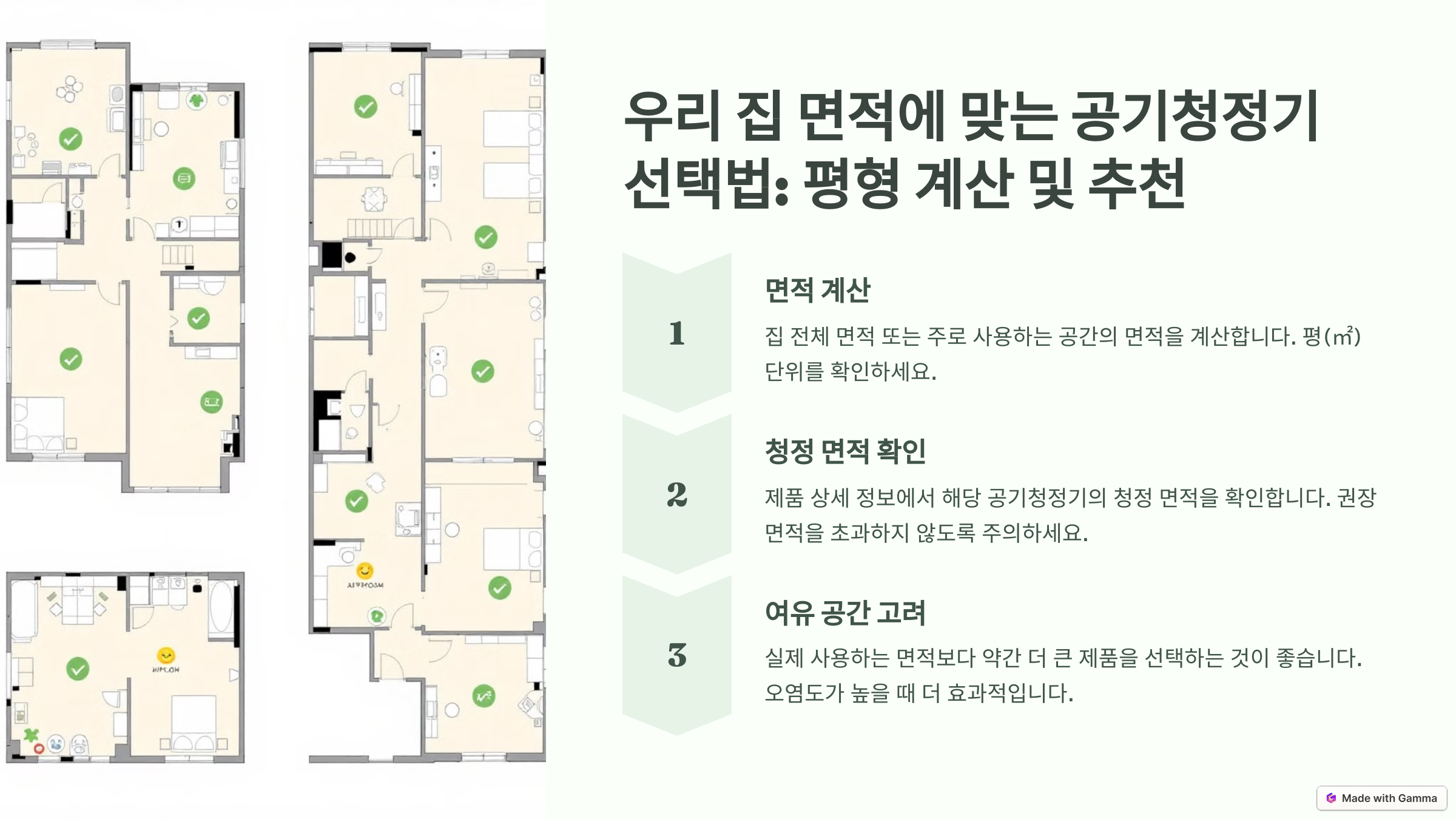 청정면적 : 사용할 공간의 크기에 맞는 청정면적을 가진 제품을 선택해야 합니다. 예를 들어, 침실이나 원룸과 같은 작은 공간에는 약 10평형(33㎡) 이하의 제품이 적합합니다.