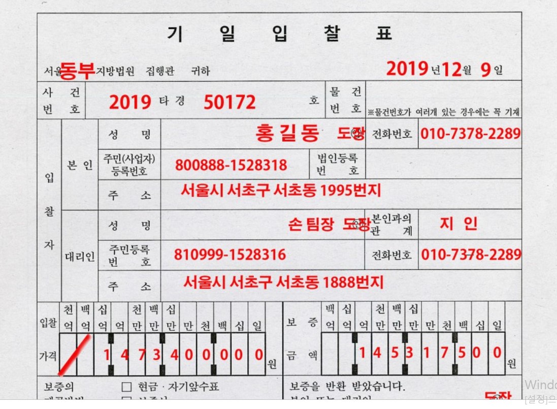 입찰표 작성은 별로 어려운 건 없으나, 딱 하나만 주의하면 됩니다. 입찰 가격을 한번 적으면, 절대 수정해서는 안됩니다. 만약, 입찰가격을 수정해야 한다면 반드시 새 입찰 용지에 다시 쓰시는 게 좋습니다.