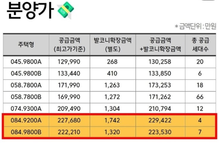 √ 84A타입 당첨시 계약금 약 4억 5,884만원 필요!!!