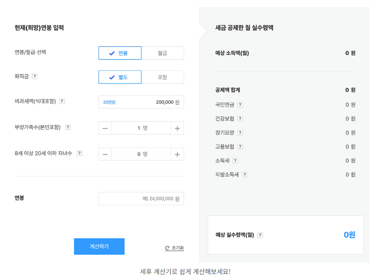 - 계산 버튼 클릭 : 모든 정보를 입력한 후, 계산 버튼을 클릭하면 세후 월급이 자동으로 계산됩니다.