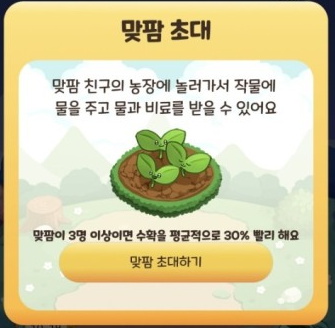 맞팜 활용 : 친구를 초대하여 맞팜을 맺고, 서로의 농장에 물과 비료를 주며 협력합니다.