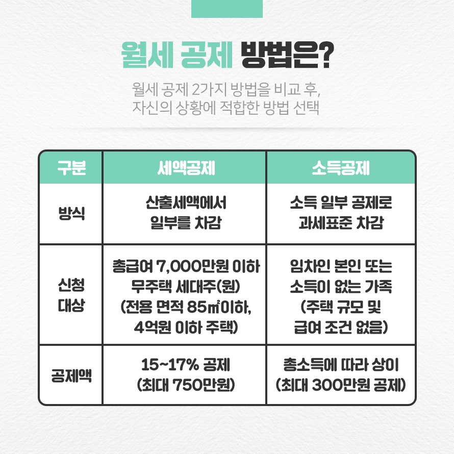 - 임대차 계약 : 임대차 계약이 체결되어 있어야 하며, 월세를 현금으로 지급한 경우에 한합니다.