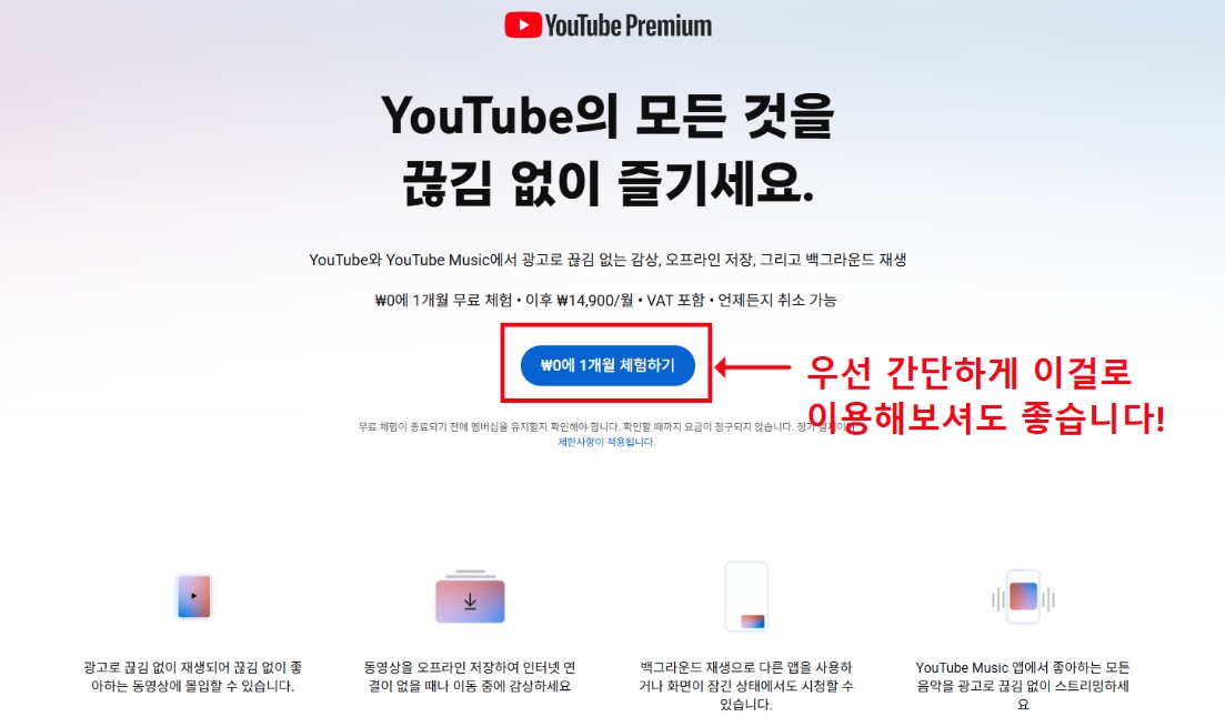 - 유튜브 프리미엄 첫 가입 시 1~2개월 무료 체험 가능