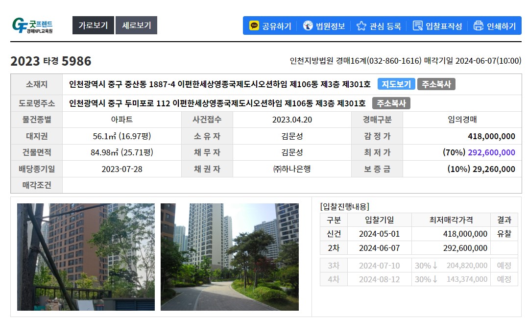 인천 중구 하늘도시에 있는 아파트로 물건번호 2023 타경 5986 경매 물건으로 건물 면적 25.71평 대지권 16.97평 감정가 418,000,000원 1회 유찰되어 현재 최저가 292,600,000원에 나와있는 물건 입니다.