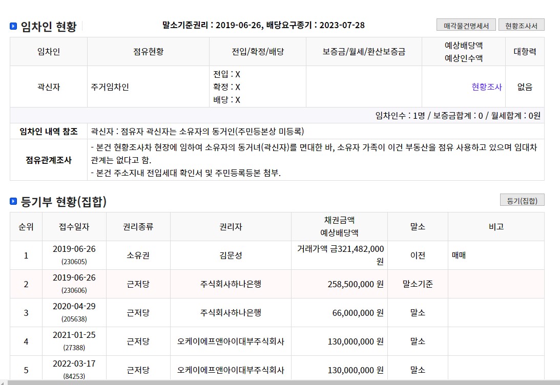 소유자 겸 채무자가 동일인이고 임차인은 곽00씨로 나와 있으나 소유자의 동거인으로 권리관계가 없는 분입니다. 등기부도 살펴보면 매매시 하나은행에 근저당 설정하고 258,500,000원을 대출받아 매매 했다는걸 알수 있으며 선순위자가 하나은행이며 말소기준 권리입니다.
