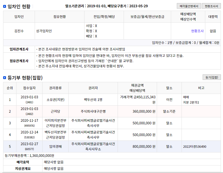 임대차인 현황은 김진수님이 편의점을 하고 계시고 사업자등록, 확정일자, 배당신청은 하지 않을걸로 나와 있습니다. 등기부등본을 보면서 권리분석을 해보면 백두산, 이지희씨 두분이 1/2공동소유하고 계시고 소유권 이전(매매시) 대구은행으로 부터 3억6천만원을 대출 받아 구매했다는걸 알수 있으며 말소기준도 19년 1월3일 근저당이 1순위 입니다. 그 아래로 주식회사 피씨엠에서 5억을 빌려주면서 추가로 근저당 설정을 하였지만 순위는 2순위입니다.