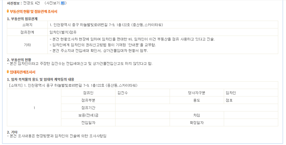 법원 직원들이 현장방문하여 확인한 사항을 기록해 놓은 현황조사서 입니다. 임차인 김진수라는 분이 계시고 사진상으론 편의점을 하고 계시네요~전입세대신고 및 상가건물전입신고도 하지 않았다고 함.