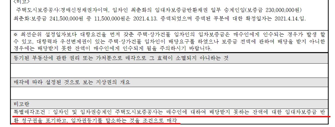 또한 어떤 매각물건명세서에는 임대차보증금 반환청구권을 포기한다고만 쓰여있고 임차권 등기 말소에 대한 내용이 없는 경우도 있으니 꼭 청구권포기와 임차권 등기말소 조건이 있는지 확인 하시길 바랍니다.