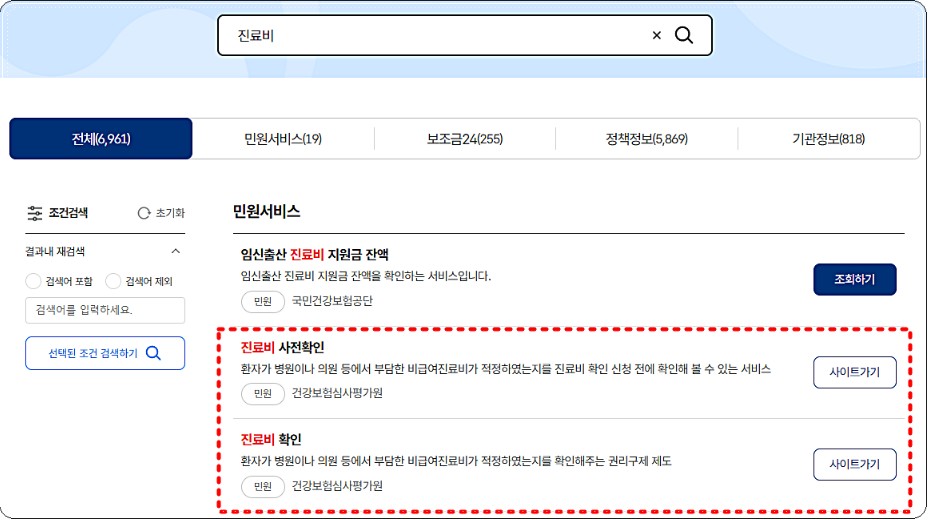 - 상단 검색창에 ‘진료비 영수증’ 또는 ‘진료받은 내용’ 검색