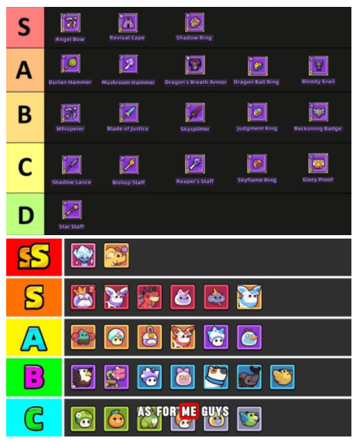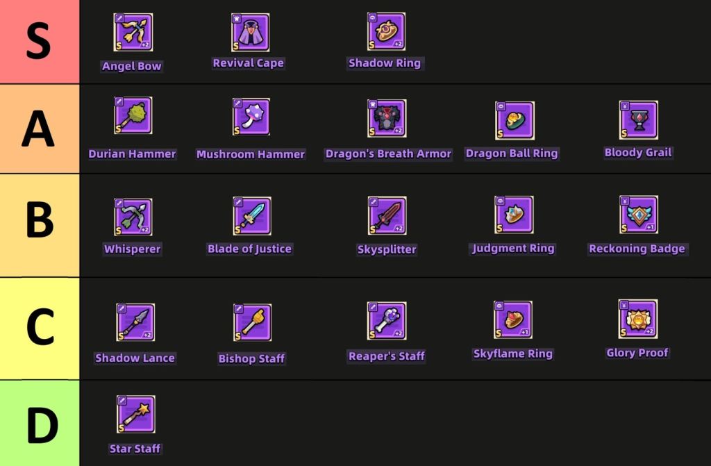 - S-Tier 아이템 : 천사의 활, 부활 망토, 그림자 반지와 같은 아이템들이 포함되어 있습니다. 이 아이템들은 전투에서 큰 도움이 됩니다.