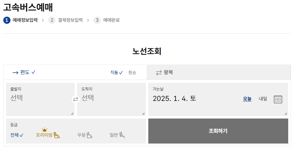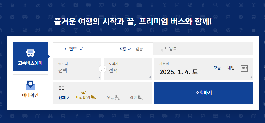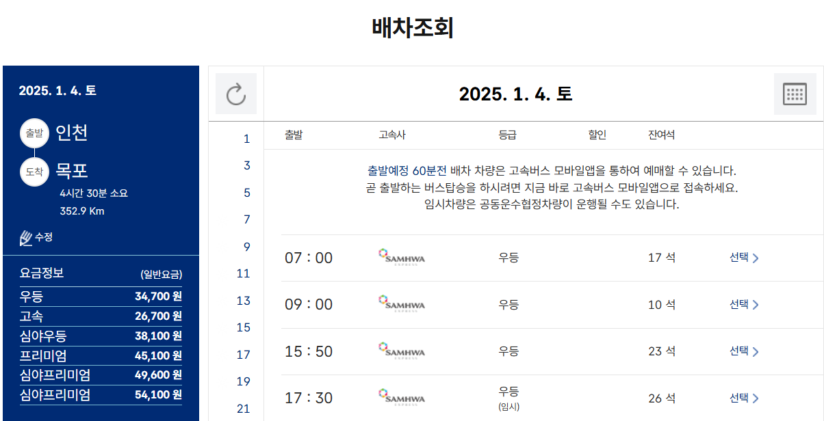 - 버스 등급 선택: 일반, 우등, 프리미엄 등 원하는 버스 등급을 선택합니다. 각 등급은 좌석의 편안함과 부가 서비스에 따라 요금이 다르므로 참고하여 선택합니다.