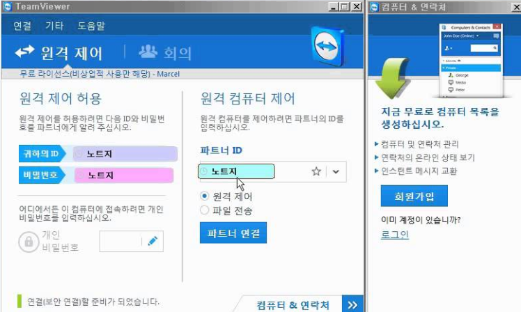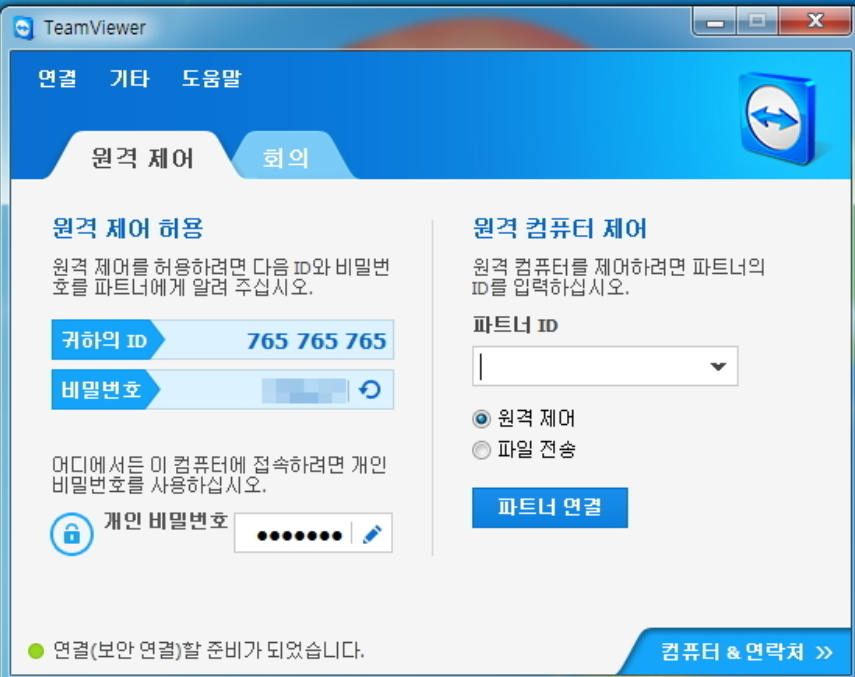 - 다른 컴퓨터에 접속하려면 상대방의 '파트너 ID'를 입력하고 '연결' 버튼을 클릭합니다.