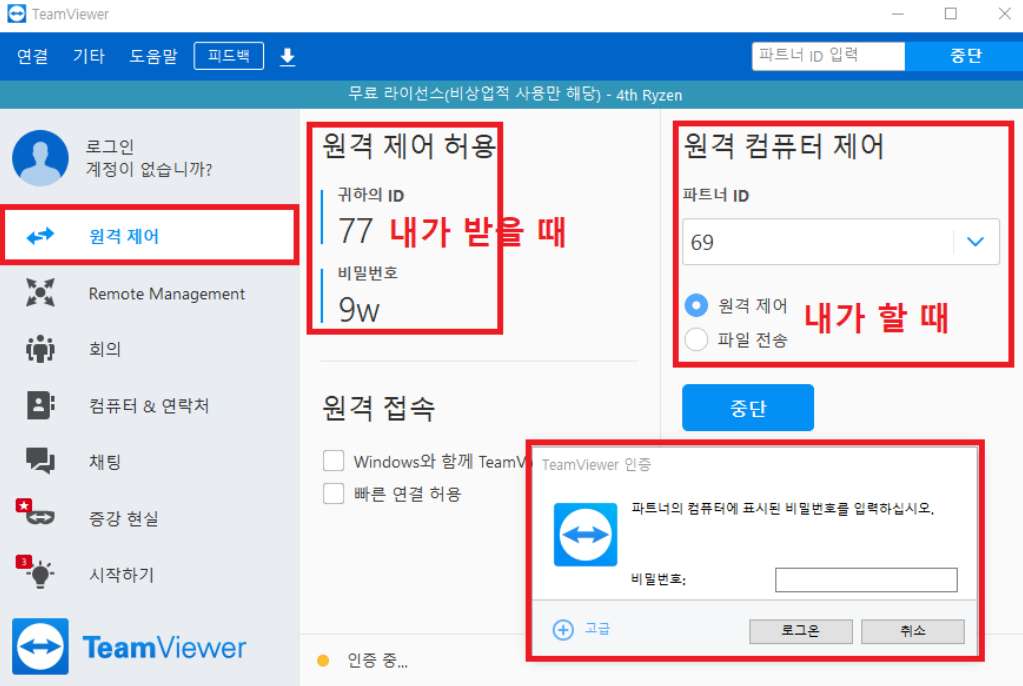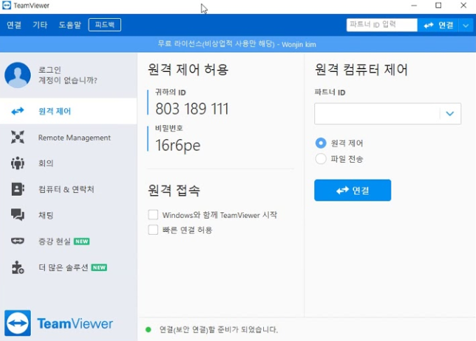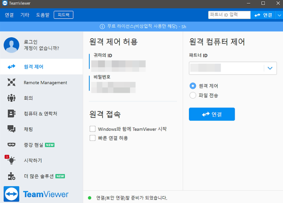 - 팀뷰어를 실행하면 '귀하의 ID'와 '비밀번호'가 표시됩니다. 이 정보는 다른 사용자가 귀하의 컴퓨터에 접속할 때 필요합니다.
