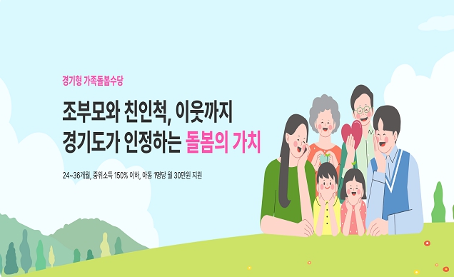 경기형 가족돌봄 수당은 맞벌이, 다자녀 등의 이유로 아동을 양육하는 데 도움이 필요한 가정에 조부모를 포함한 4촌 이내의 친인척 또는 이웃 주민이 대신 아이를 돌봐주면 돌봄수당을 지급하는 제도입니다. ‘육아로 인한 심신의 피로, 조부모의 무상 돌봄 노동, 과다한 민간 돌봄 비용 지출’ 해결을 위해 도입되었어요.