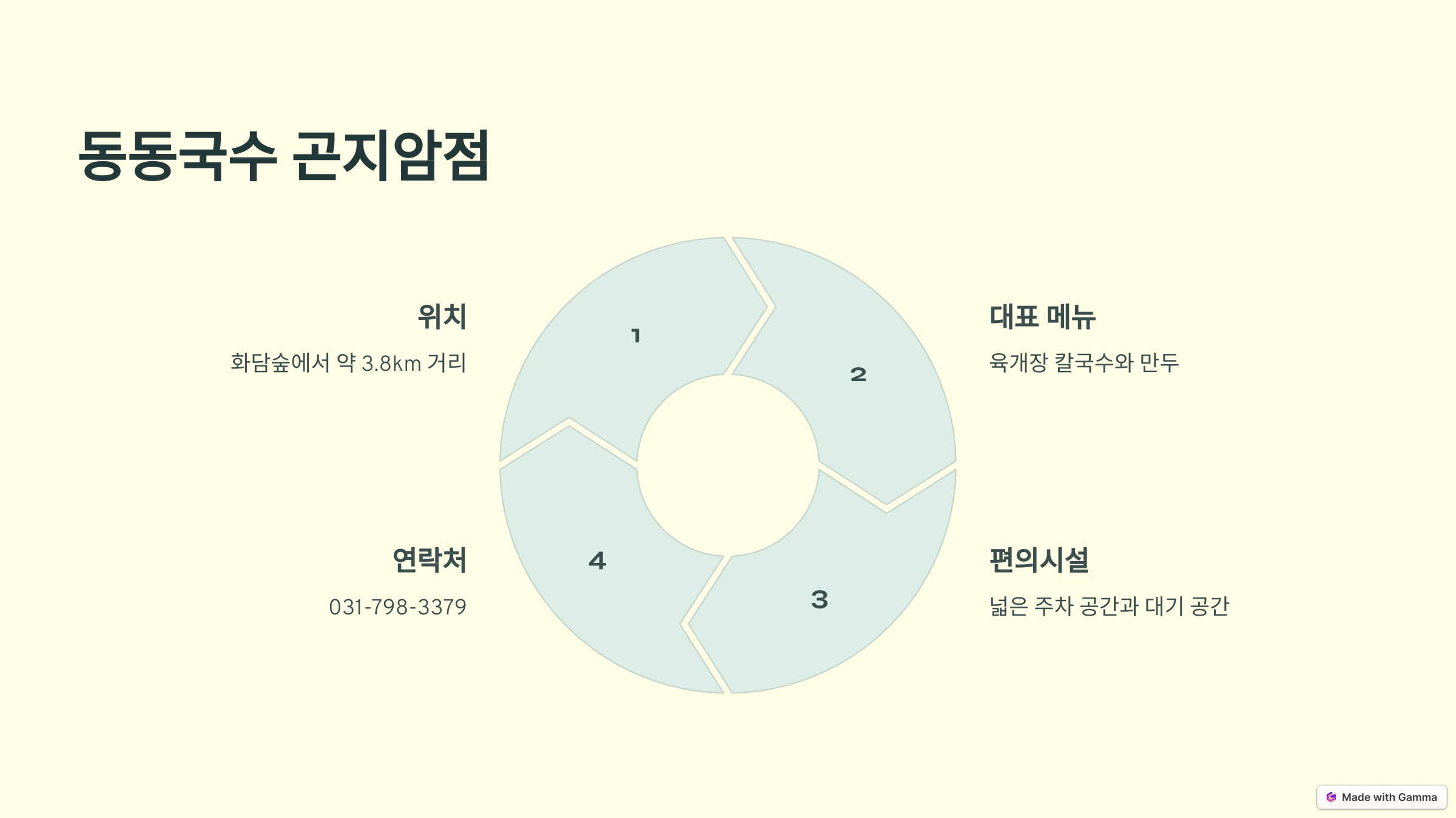 화담숲에서 약 3.8km 거리에 위치한 국수 전문점으로, 육개장 칼국수와 만두가 대표 메뉴입니다. 넓은 주차 공간과 대기 공간을 갖추고 있어 단체 손님이나 가족 단위 방문객들에게 적합한 장소입니다.