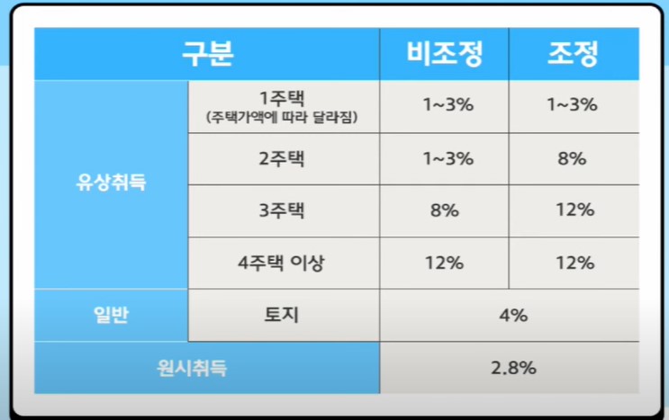사람이 많이 몰려 있지 않고 비교적 집값이 안정된 경우라면 취득세율이 1%에서 3% 정도라고 하는데요. 아무래도 집값이 급격히 오르고 많은 사람이 원하는 주거지역일수록 1 가구 1 주택으로 집값을 안정시키고자 하는 정책으로 보입니다. 1 가구 2 주택을 구입할 경우에는 취득세 외에도 몇 가지 세금이 더 붙게 됩니다.