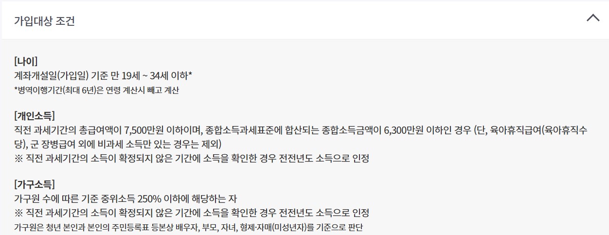 연령 : 가입일 기준 만 19세 이상 만 34세 이하인 청년이 대상입니다. 단, 병역 의무를 이행한 경우, 그 기간(최대 6년)을 연령 계산 시 제외합니다. 예를 들어, 만 36세이지만 2년간 군 복무를 했다면, 실제 연령은 만 34세로 간주되어 가입이 가능합니다.