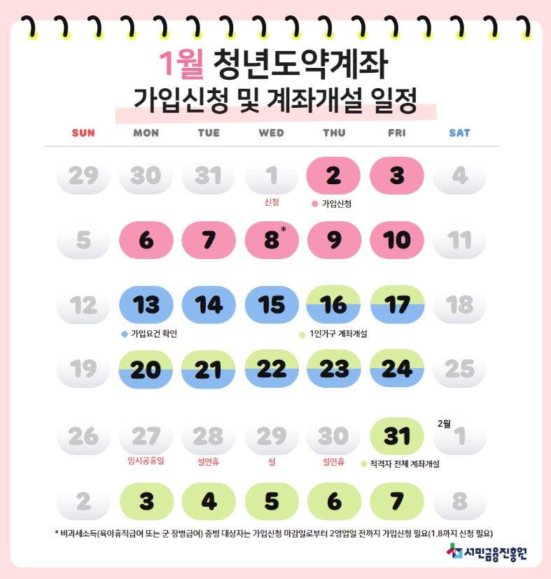 청년도약계좌는 매월 정해진 기간에 신청을 받습니다. 예를 들어, 2024년 10월 신청 기간은 10월 2일(수)부터 10월 11일(금)까지였습니다. 신청 기간은 매월 변경될 수 있으므로, 정확한 신청 기간은 해당 월의 공지사항을 통해 확인하시는 것이 좋습니다. 일반적으로 신청 기간은 매월 초에 시작되어 약 1~2주간 진행됩니다.