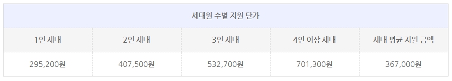 바우처 지원 금액은 세대원 수에 따라 차등 지급됩니다. 1인 가구는 295,200원, 2인 가구 407,500원, 3인 가구 532,700원, 4인 가구는 701,300원을 지급합니다. 세대 평균으로는 367,000원가량 지원받는 효과를 볼 수 있어요. 세대원 수는 주민등록표 등본에 포함되는 세대원으로 산정됩니다.