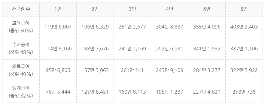 - (생계급여) 기준중위소득 30%, (의료급여) 기준중위소득 40%, (주거급여) 기준중위소득 47%, (교육급여) 기준중위소득 50%