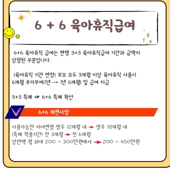 6+6 육아휴직 제도는 부모에게 많은 혜택을 제공하는 제도입니다. 자녀와의 소중한 시간을 보내고자 하는 부모님들에게 큰 도움이 될 것입니다. 추가적인 정보는 고용노동부의 공식 웹사이트나 가까운 고용센터를 통해 확인할 수 있습니다. 육아휴직을 통해 자녀와의 행복한 시간을 만끽하시길 바랍니다.