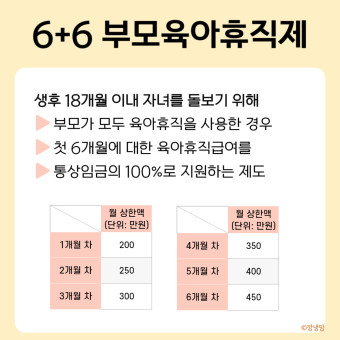 6+6 육아휴직은 부모가 자녀의 출생 후 6개월 동안 육아휴직을 사용하고, 이후 6개월 동안은 다른 부모가 육아휴직을 사용할 수 있는 제도입니다. 이 제도는 부모가 자녀 양육에 적극적으로 참여할 수 있도록 돕기 위해 마련되었습니다. 특히, 이 제도는 부모가 각각의 육아휴직을 사용할 수 있어, 자녀와의 시간을 더욱 효율적으로 활용할 수 있는 장점이 있습니다.