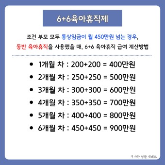 6+6 육아휴직을 통해 지원받는 급여는 고용보험에서 지급됩니다. 육아휴직 급여는 기본적으로 월 급여의 80%를 지급받으며, 최대 150만 원까지 지원됩니다. 또한, 육아휴직을 사용하는 부모가 서로의 육아휴직을 나누어 사용할 경우, 추가적인 지원이 있을 수 있습니다. 이와 같은 지원 내용은 부모가 자녀 양육에 전념할 수 있도록 도와줍니다.